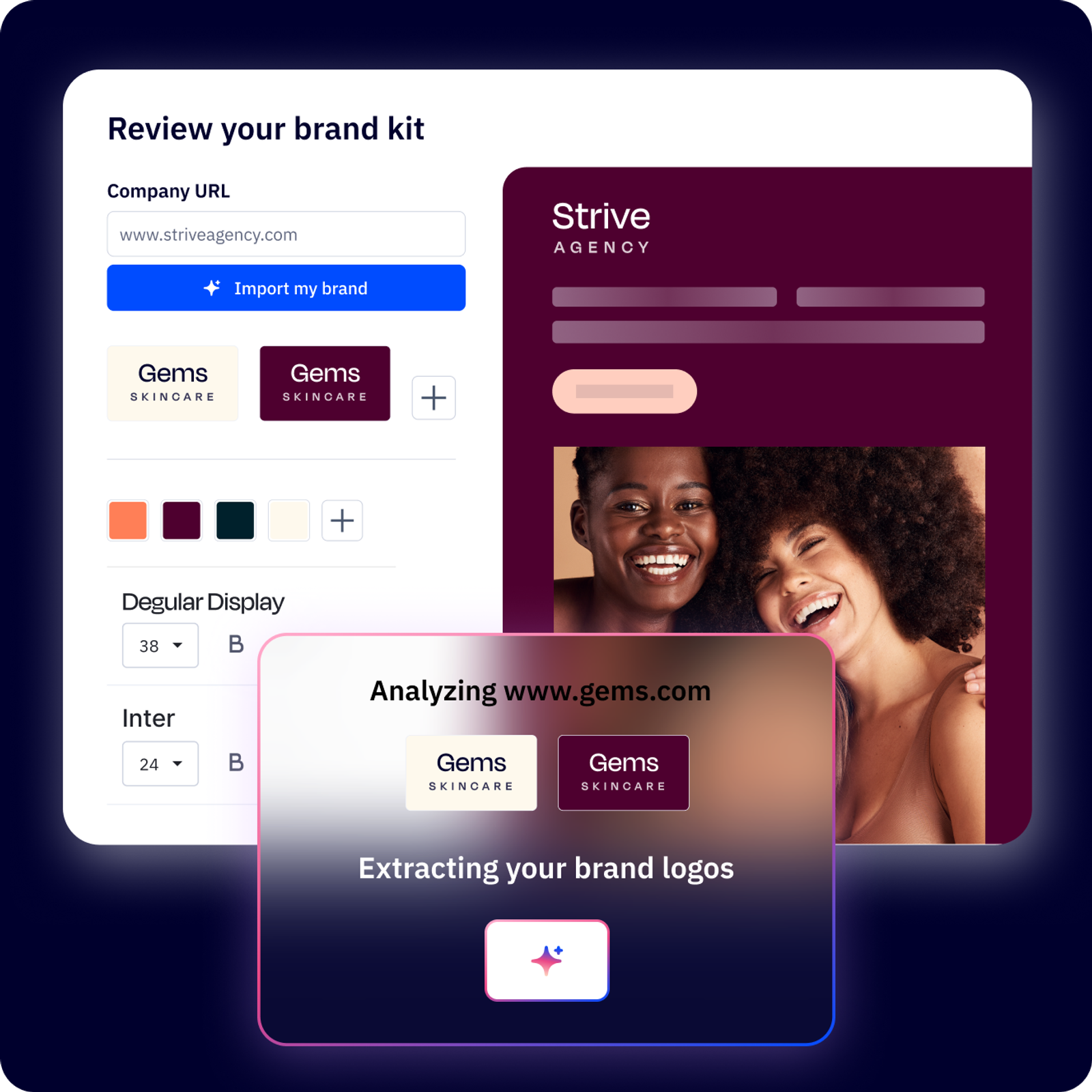 AI Brand Kit automatically pulls your logos, fonts, colors, and visual elements directly from your website URL to build your email templates.