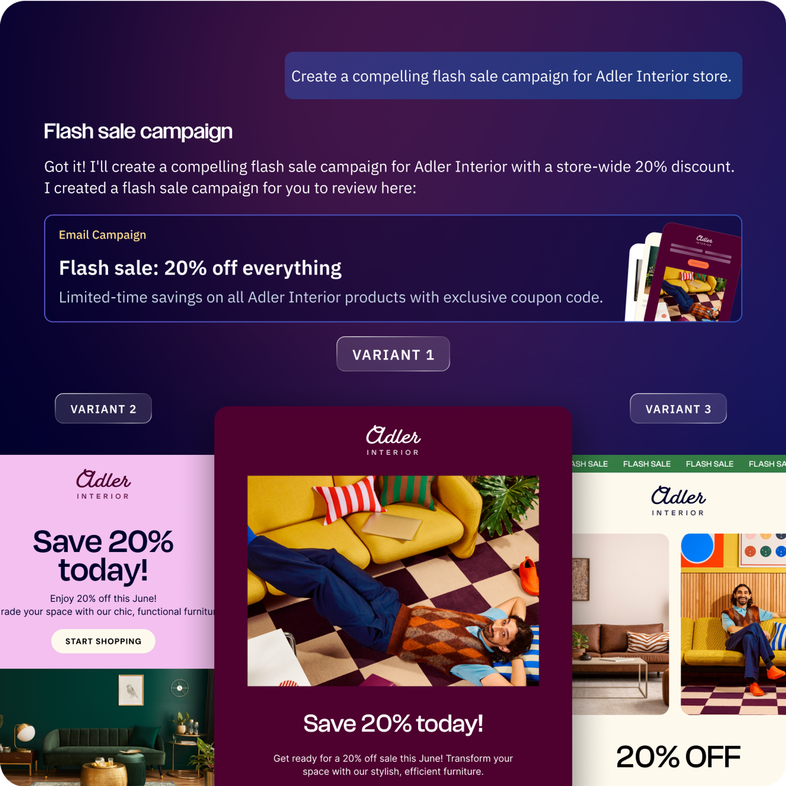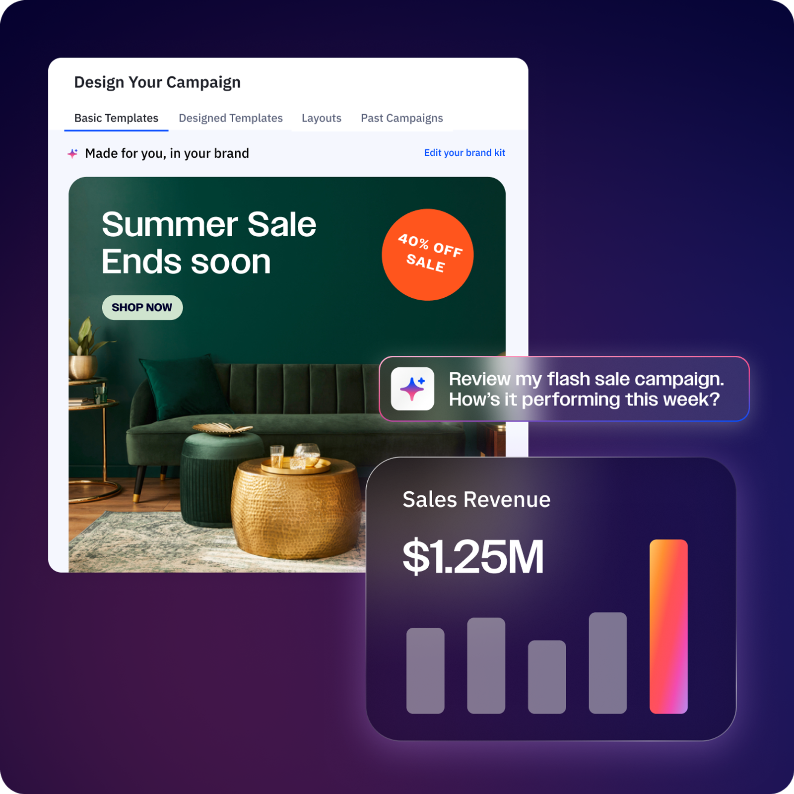Start with just a sentence about your goals and watch AI build complete email campaigns, including subject lines, body content, and images. Get professional-quality emails that would normally take hours to create, ready in minutes.