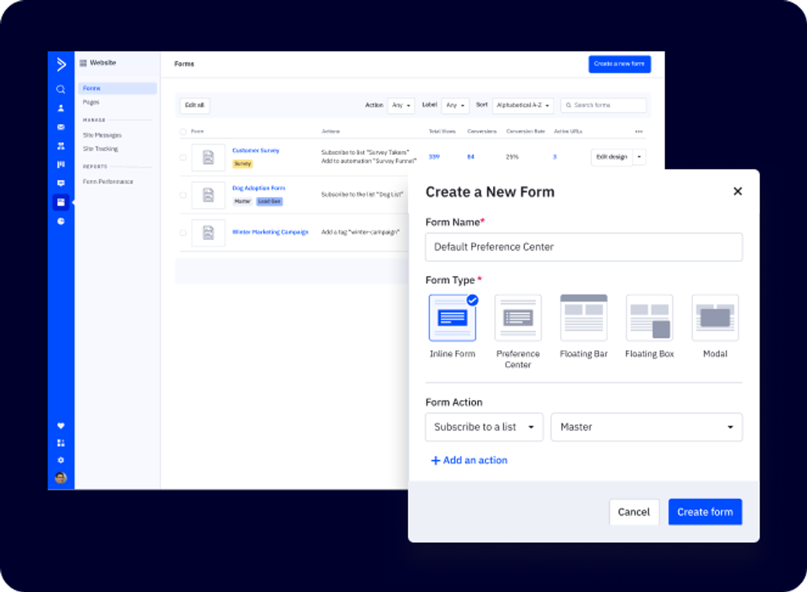ActiveCampaign’s drag-and-drop form builder lets you create sign-up forms, surveys, and lead magnet opt-ins in minutes.