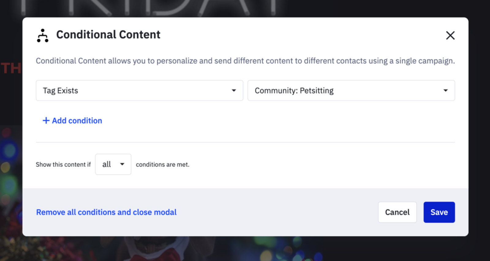 Conditional Content is a tool with the campaign builder that allows you to hide or display content blocks based on certain contact data, like tags. Instead of creating new campaigns for every group of contacts based on the tag information you’ve collected, you can leverage conditional content and tag segments to do that for you!