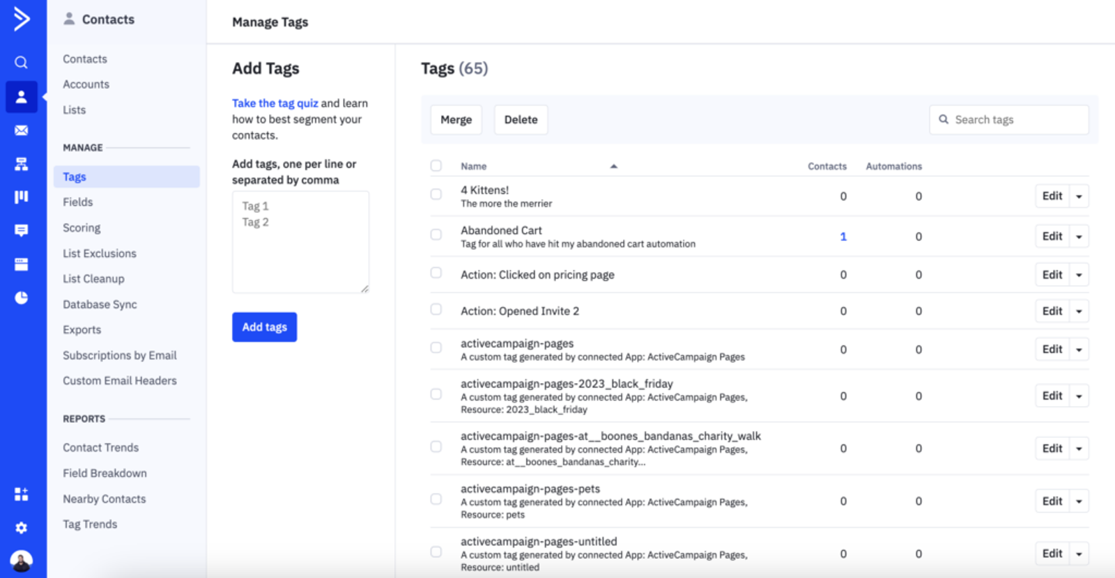 Tags can help you stay organized with your contacts’ data and also trigger actions based on being added or removed. In your ActiveCampaign account, there are core functionalities of tags that will help you get started, let’s check them out!